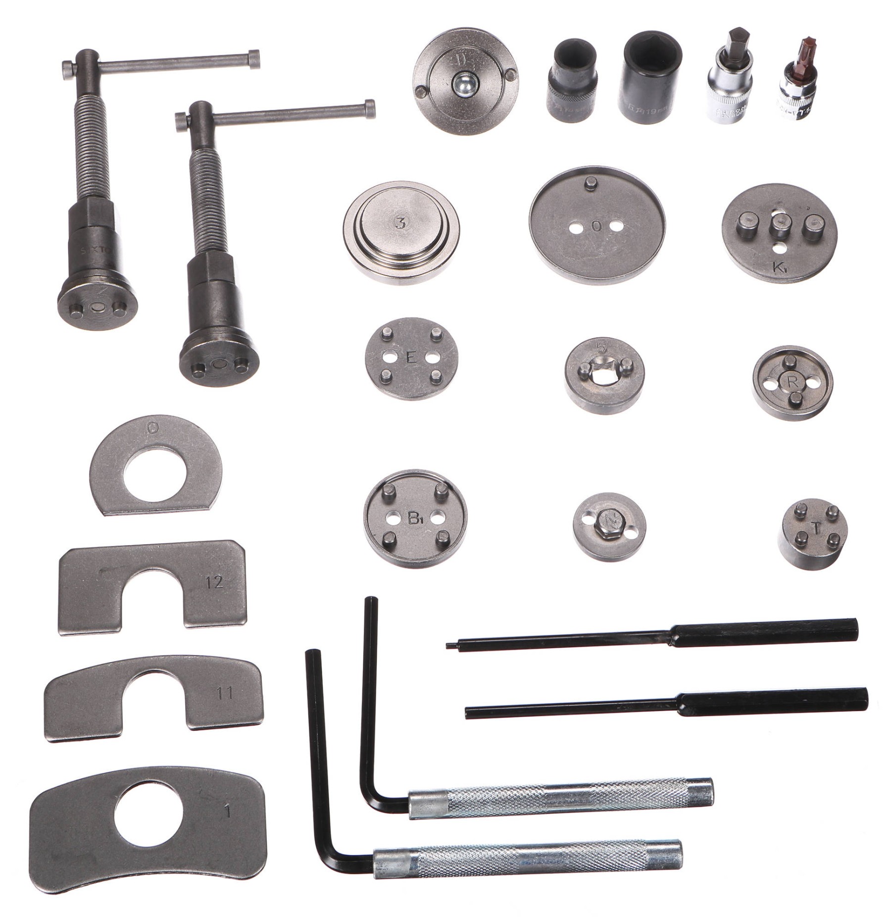 zawiera prawoskrętną i lewoskrętną śrubę do cofania z magnesem, cztery ograniczniki, dwa klucze imbusowe, przecinaki, pojemnik na smar oraz wiele różnych adapterów. W pojazdach z zaciskami hamulcowymi zintegrowanymi z mechanizmem hamulca ręcznego cofanie tłoków hamulcowych odbywa się poprzez obrót wsteczny, w innych pojazdach poprzez cofanie tłoków.