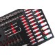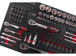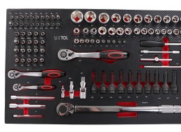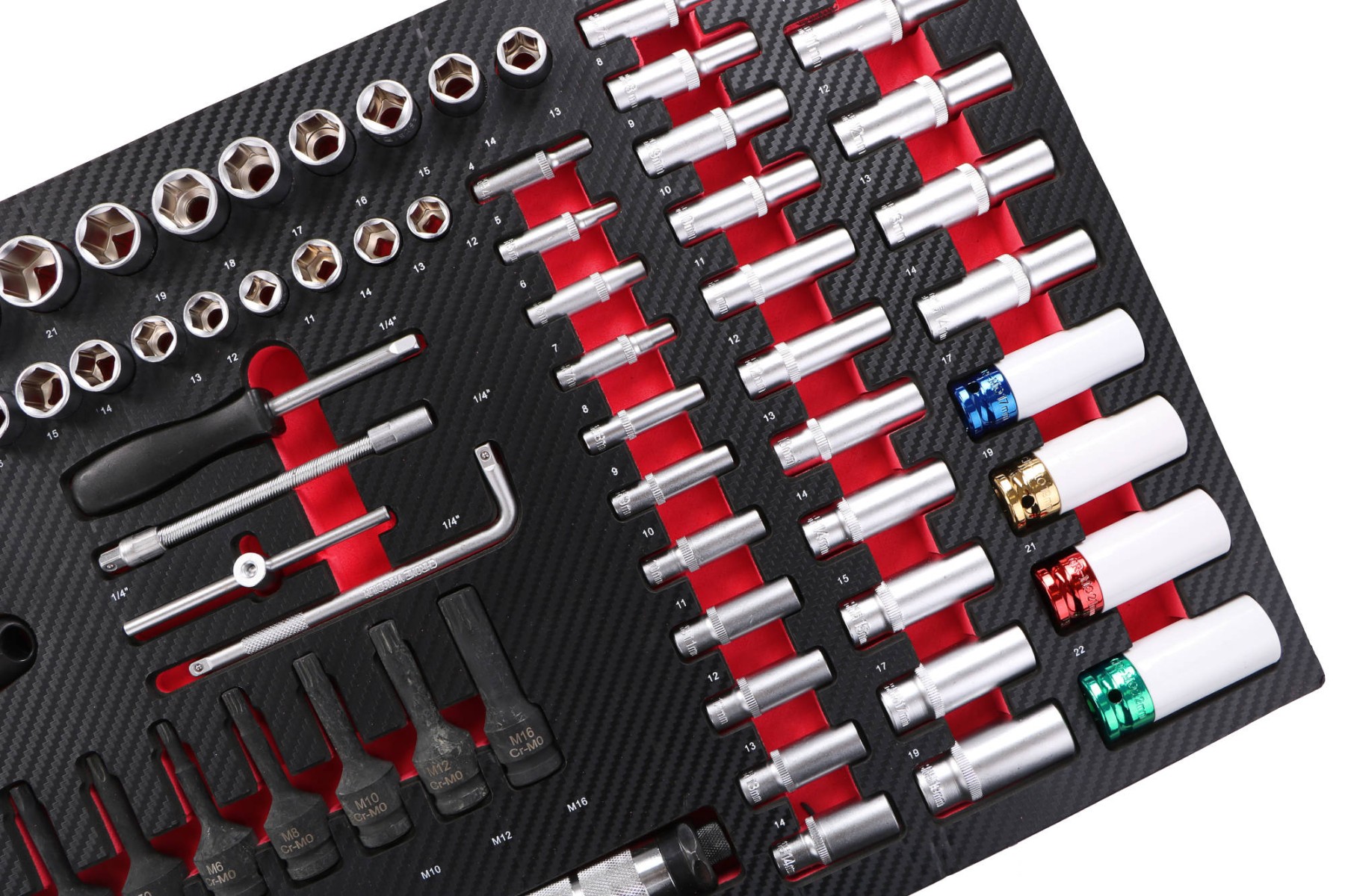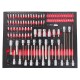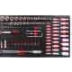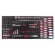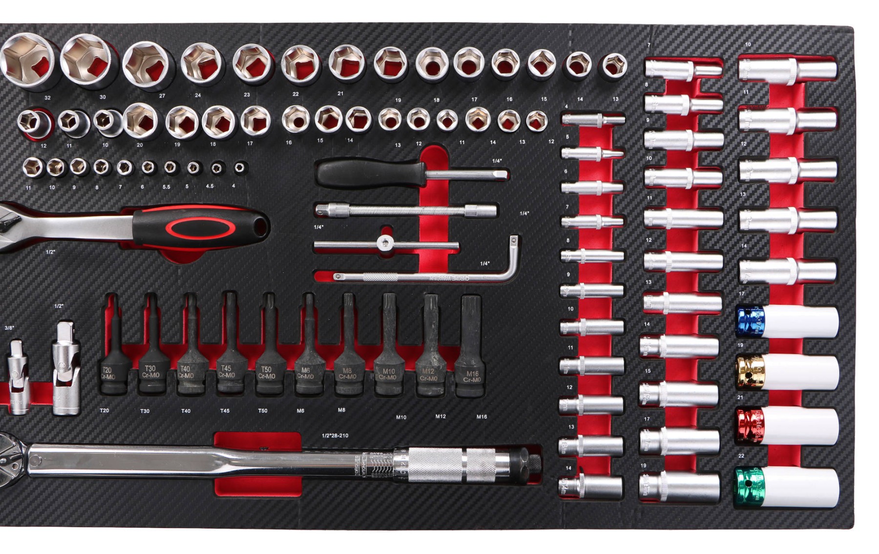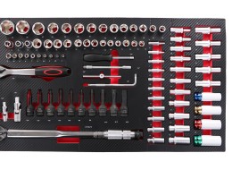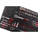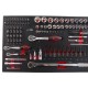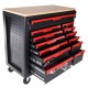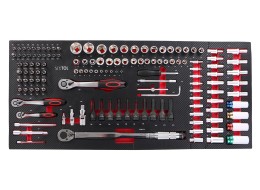 Zawartość wózka:- 1. Szuflada – 136x Nasadki, bity, grzechotki, przedłużenia i klucz dynamometryczny