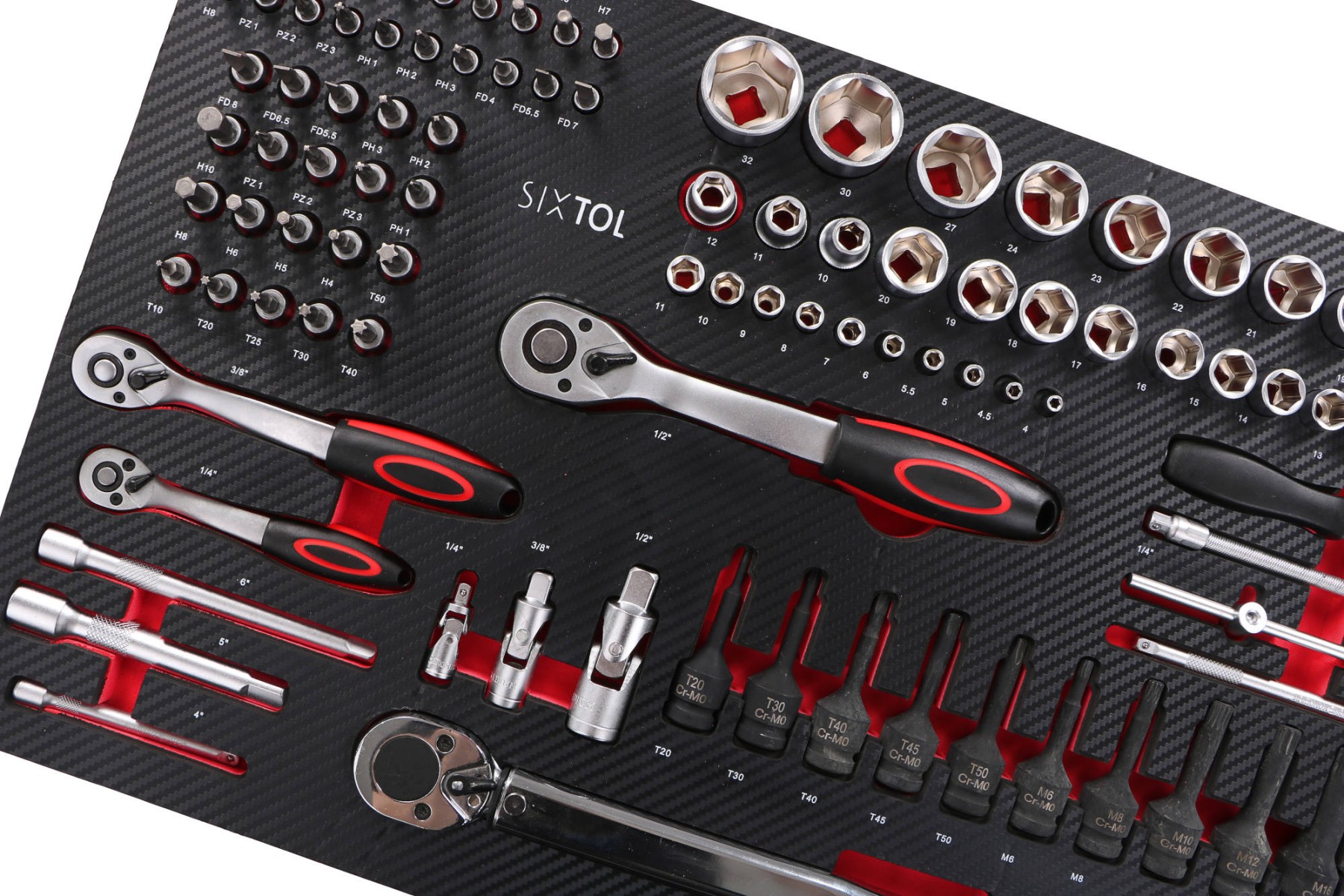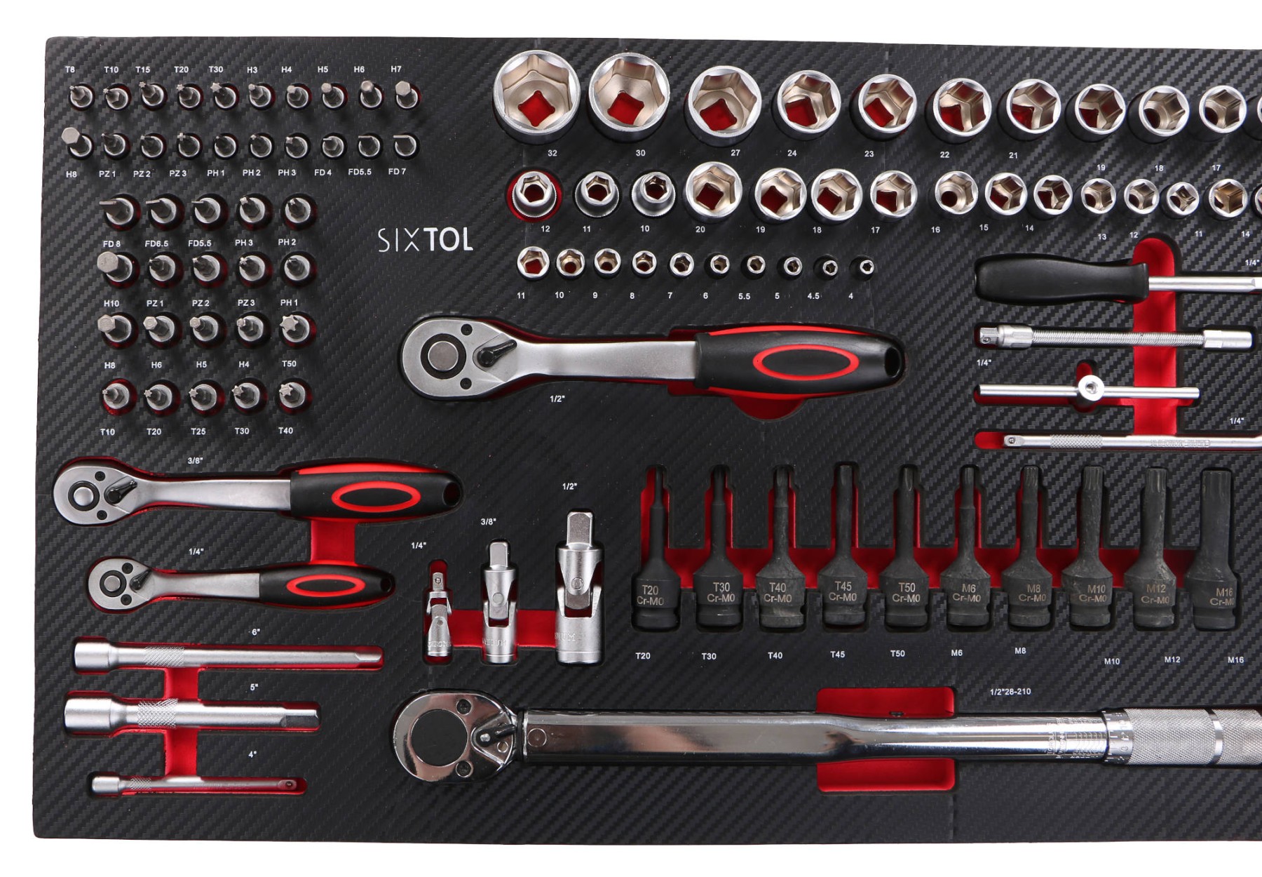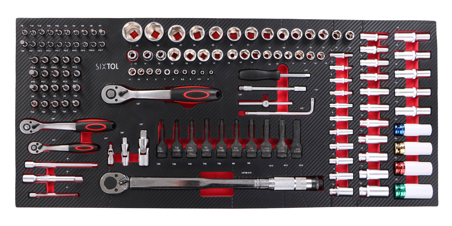 Zawartość wózka:- 1. Szuflada – 136x Nasadki, bity, grzechotki, przedłużenia i klucz dynamometryczny