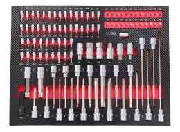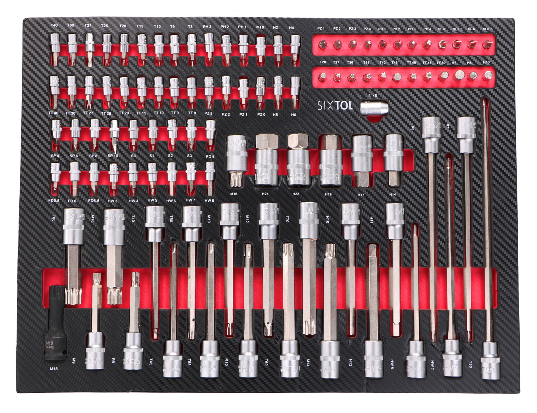 - 13x 1/2" końcówki bitowe 140 mm: Torx: T40, T45, T50, T55, T60, T70; Spline: M10, M12, M14; Imbus: H10, H11, H13; R10