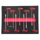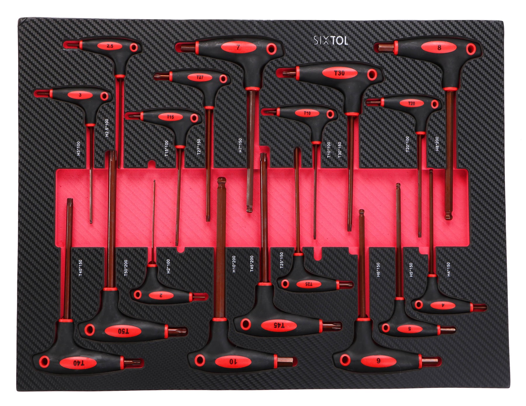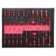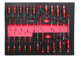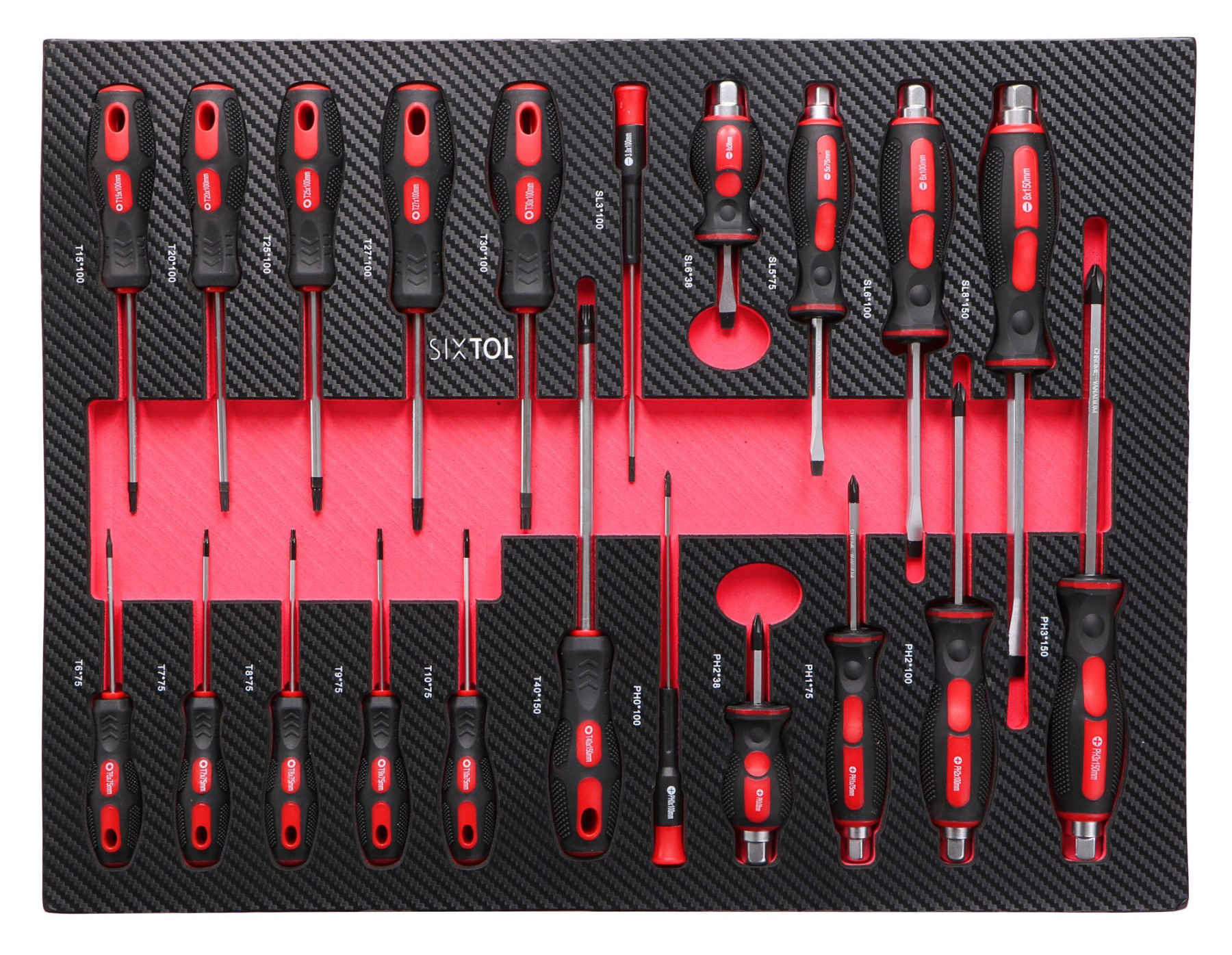 - Klucze T HEX (imbus): H2 × 100 mm; H2.5 × 100 mm; H3 × 100 mm; H4 × 150 mm; H5 × 150 mm; H6 × 150 mm; H7 × 150 mm; H8 × 200 mm; H10 × 200 mm- 7. Szuflada – 21x śrubokręty (materiał 40Cr)