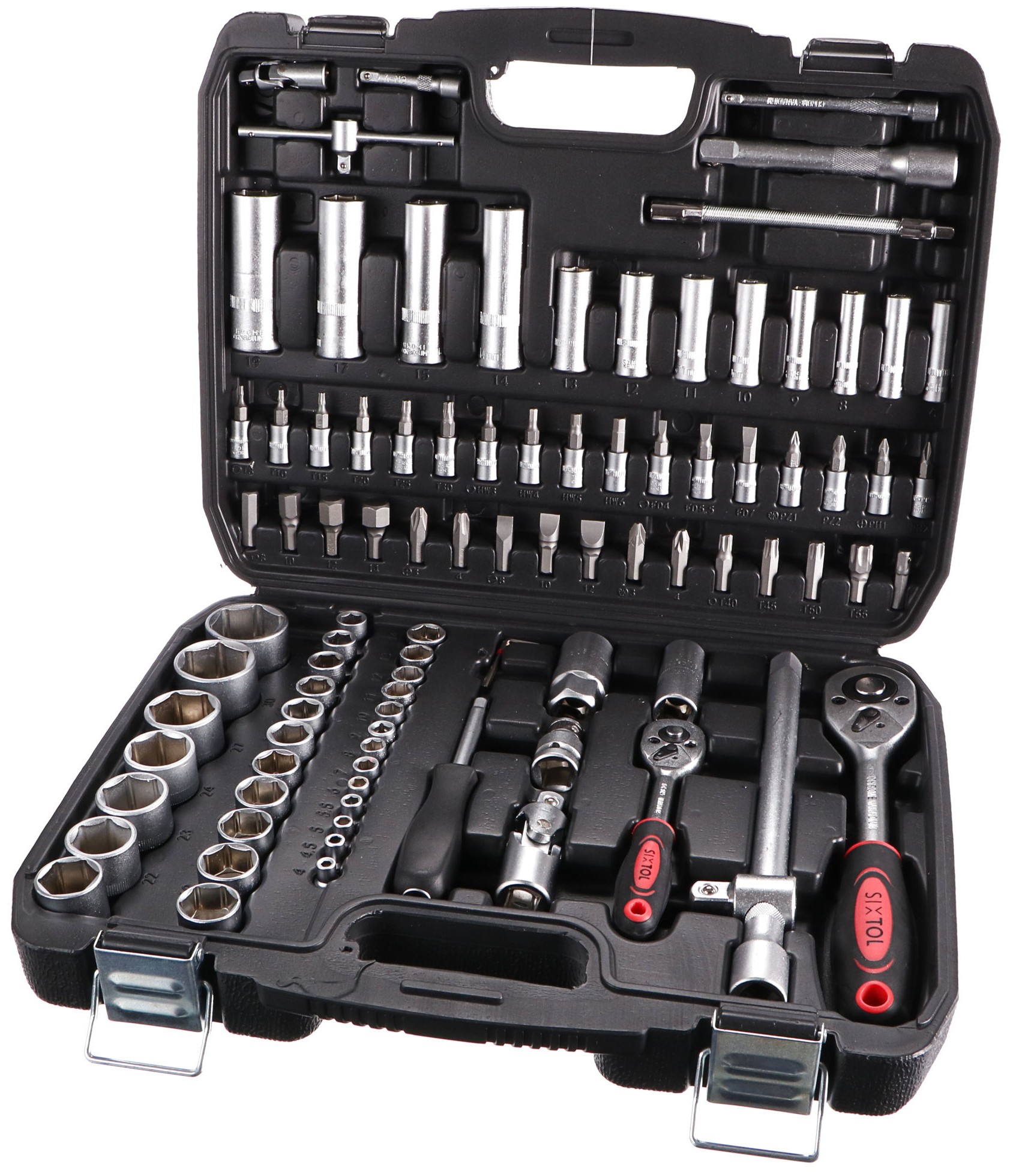 Zestaw nasadek SIXTOL z 94 elementami nasadek i bitów z grzechotkami w trwałej plastikowej walizce. Ten zestaw jest idealny do każdego warsztatu lub garażu. Zawiera szeroki wybór nasadek, kluczy imbusowych, bitów, dwie grzechotki, uniwersalny uchwyt na śrubokręt i więcej.